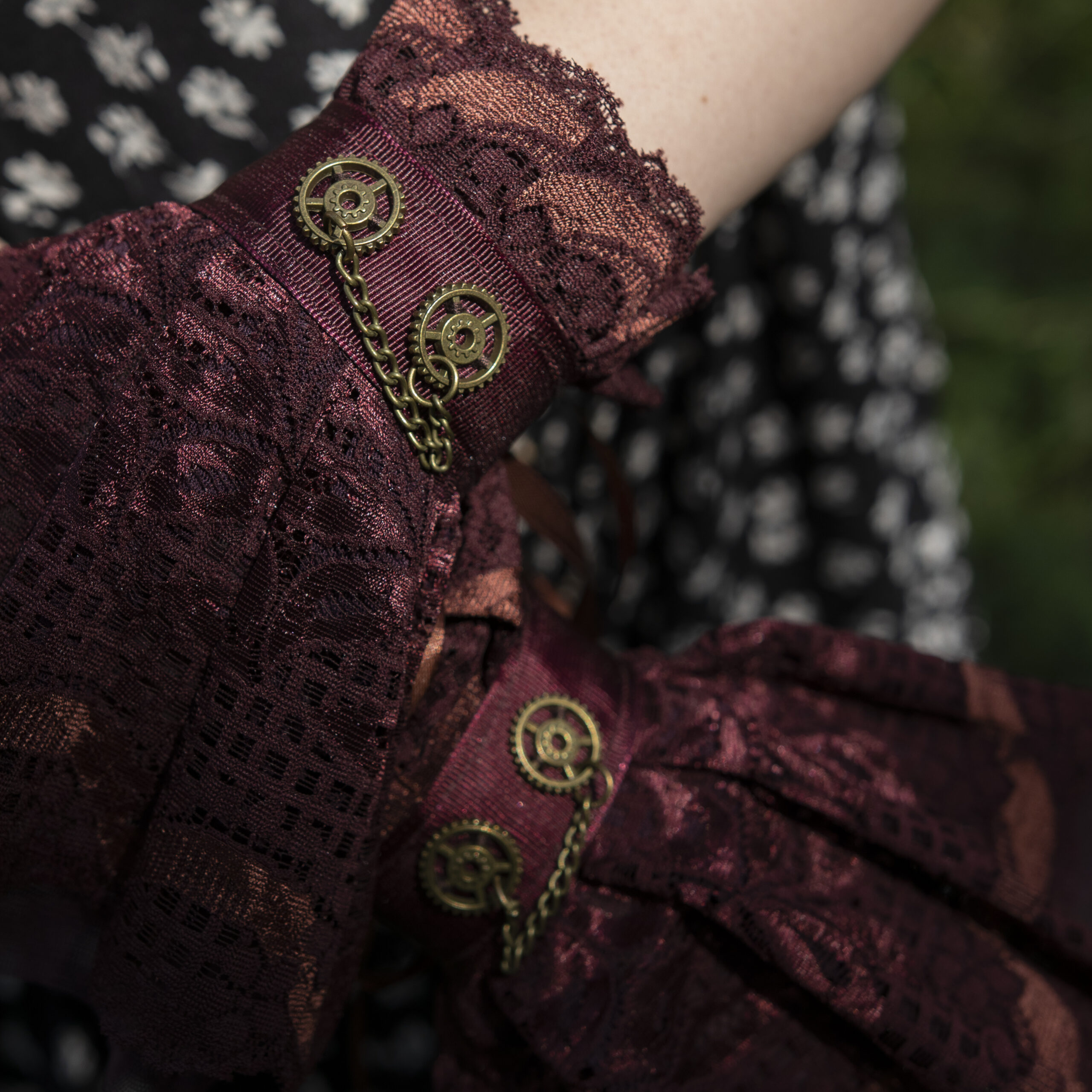 Tvoje Steampunk bordo manžetne sa zupčanicima dužine su 19 cm, pa će elegantno i prijatno ležati na tvojoj ruci zbog podesive širine. Ovu kreaciju sačinili smo uz pomoć bordo čipke, mrežice i rips trake, pa je ukrasili metalnim detaljima u obliku zupčanika i lanaca. ⚙️⛓